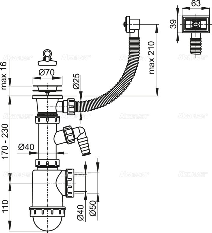 ALCADRAIN A444P DN50/40 Sifón drezový s nerezovou mriežkou 70, flexi prepadom a prípojkou