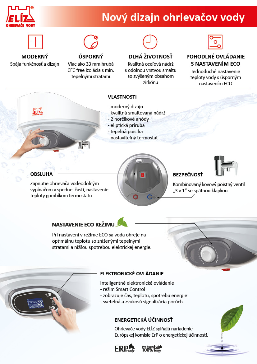 Nádrž ohrievača vody je vyrobená z kvalitnej ocele chránená vrstvou zirkónového smaltu. Kvalitná polyuretánová izolácia bez CFC hrúbky 33 mm zaručuje nízke tepelné straty a úsporu nákladov na ohrev vody. Pomocou termostatu umiestnenom na ovládacom paneli viete nastaviť teplotu vody v rozsahu 7 - 75°C, s možnosťou nastavenia režimu ECO. Pri nastevní v režime ECO sa voda ohreje na optimálnu teplotu 55°C, so zníženými tepelnými stratami a nižšou spotrebou elektrickej energie. Minimálna hodnota termostatu slúži ako ochrana proti zamrznutiu vody v ohrievači. Ohrievač má zabudované dve anódové tyče, ktoré garantujú efektívnu ochranu nádrže proti korózii a výrazne predlžujú jej životnosť. Vypínač so svetelnou kontrolkou ohrevu slúži k zapnutiu / vypnutiu ohrievača v prípade našej neprítomnosti, čo umožňuje úsporu energie.