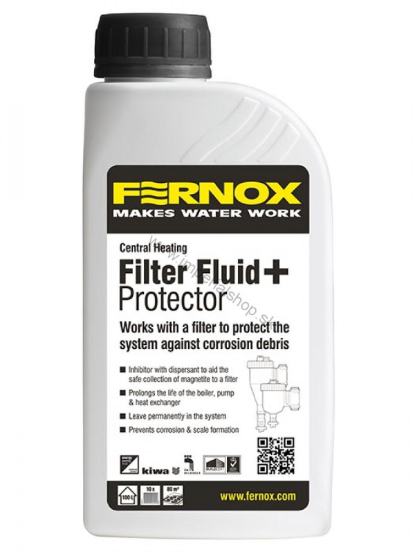 Výrobok Fernox Protector + Filter Fluid sa musí použiť s radom filtrov Fernox TF1 alebo inými zabudovanými systémovými filtrami. Použitie v systémoch s mikrotelieskom sa neodporúča. Fernox Protector+ Filter Fluid F9 je vylepšený inhibítor korózie, ktorý v sebe spája ochranu proti korózii a vlastnosti disperzného činidla. Má špecifické zloženie, vďaka ktorému dokáže zabrániť tvorbe koróznych usadenín a kontaminantov v rámci systémov ústredného vykurovania a dokáže odviesť nečistoty priamo do zapojeného filtra (napríklad niektorý filter z radu Fernox TF1 Filter), čo zabezpečuje rýchle odstránenie a zamedzenie ďalšej tvorby nečistôt. Táto funkcia systému umožňuje efektívnejší chod pri minimalizácii usadenín nečistôt v oblastiach s malým prietokom, ako sú radiátory, kde vznikajú studené miesta, čo podporuje vznik korózie pod nečistotami.