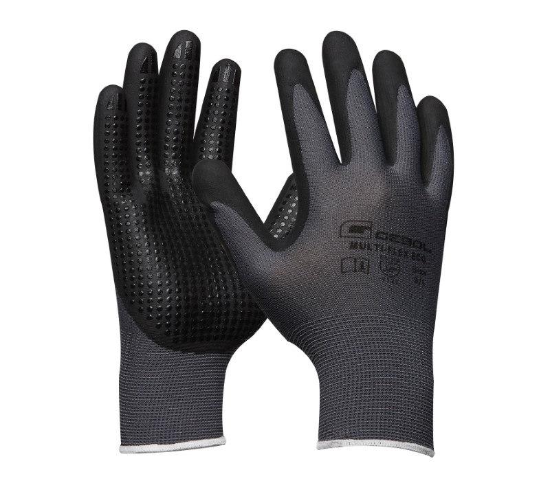 Pracovné rukavice Gebol Multi Flex Eco, vyrobený z bezšvovo jemného pleteného polyesteru s nitrilovou penovou povrchovou úpravou a nitrilovou bodkou vnútornej ruky pre lepšiu priľnavosť, dobrú priľnavosť, odpudzovanie kvapaliny a odolný voči olejom a mazivám, dobrá priľnavosť na hladké predmety.