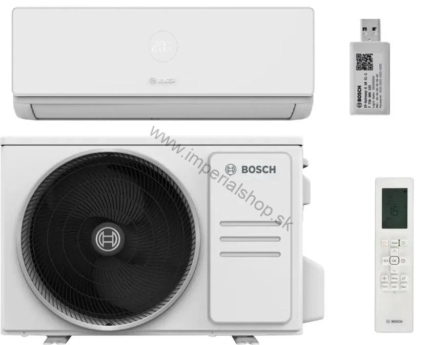 Set obsahuje: Vnútornú jednotku, vonkajšiu jednotku, modul IP-Gateway na vzdialenú komunikáciu Bosch.