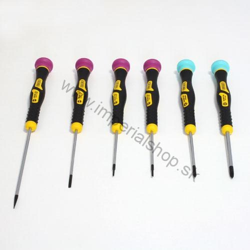 Skrutkovač určený pre montáž a opravy zariadení menších rozmerov (napr. telefóny, meracie prístroje, fotoaparáty a pod.). Driek je zo zušľachtenej vysoko legovanej ocele, povrch chrómovaný, pracovná časť čiernená. Rukoväť je 2-komponentná s kruhovým prierezom, tvrdé jadro z PP, mäkšia časť z TPE, otočný PP koniec.