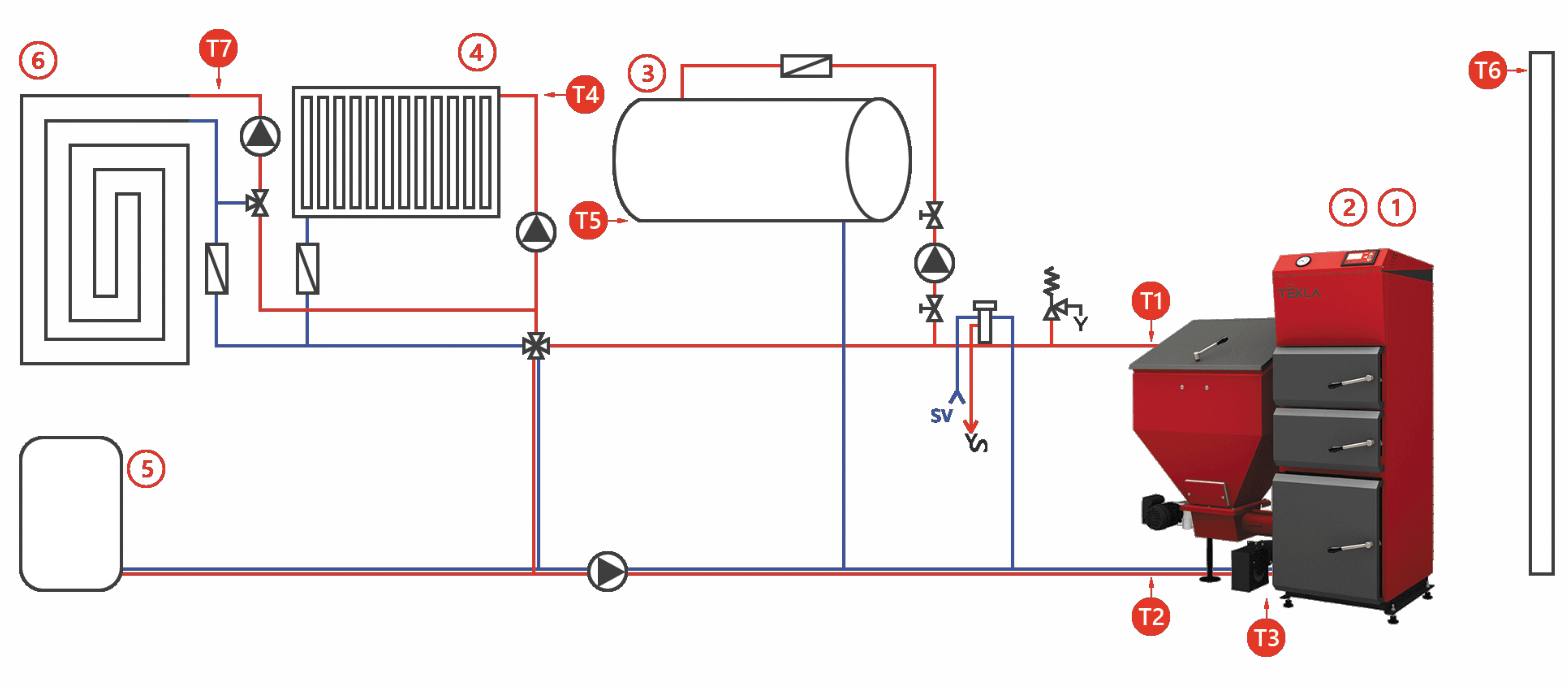 1 – automatický kotol TEKLA, 2 – regulátor, 3 – ohrievač TUV, 4 – radiátor, 5 – expanzná nádoba, 6 – podlahové kúrenie