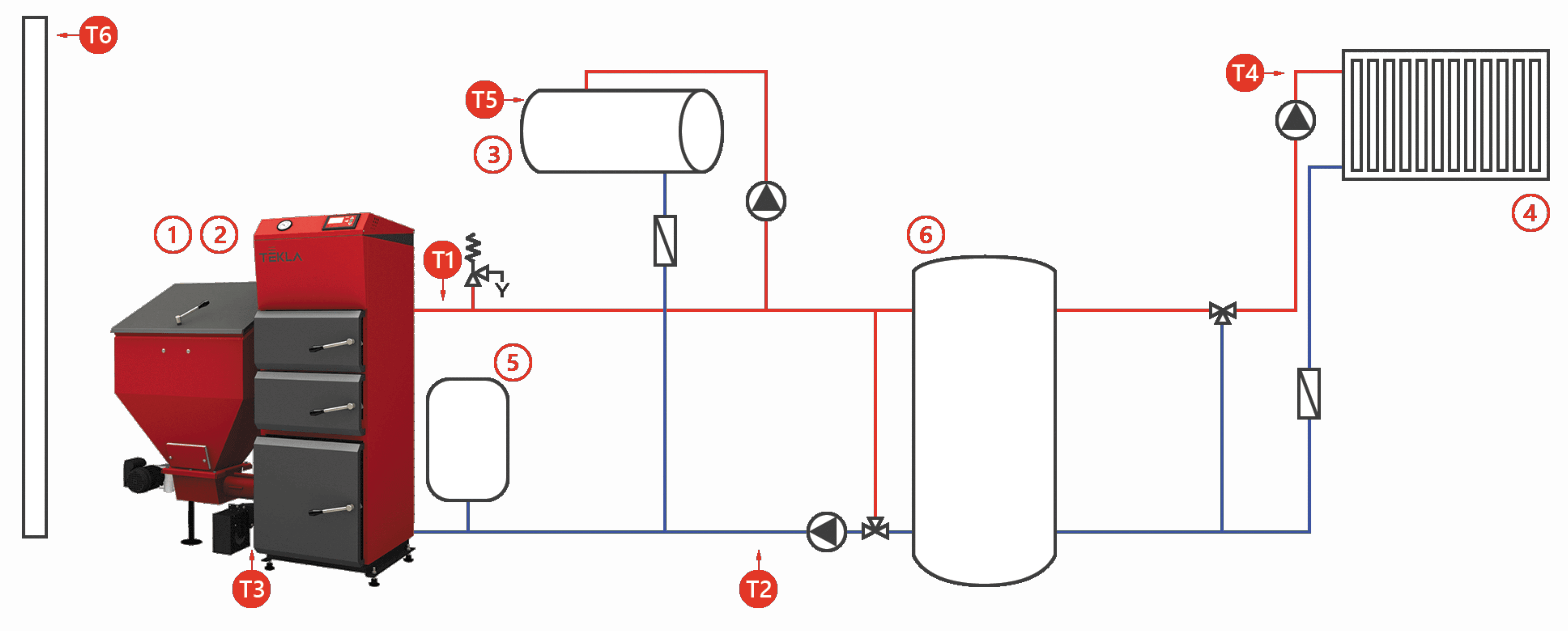 T4 – smímač teploty vody vo vykurovacom okruhu, T5 – snímač teploty TUV, T6 – snímač vonkajšej teploty